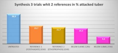 Onderstaande grafiek toont het gemiddelde resultaat van 3 proeven in Frankrijk en België na toepassing van zowel 12 kg/ha als 24 kg/ha. De toegelaten SHERPA 0.8 GR dosering in aardappels is 24 kg/ha om een voldoende lange bescherming te garanderen (dus ook voor de nieuwe knollen).